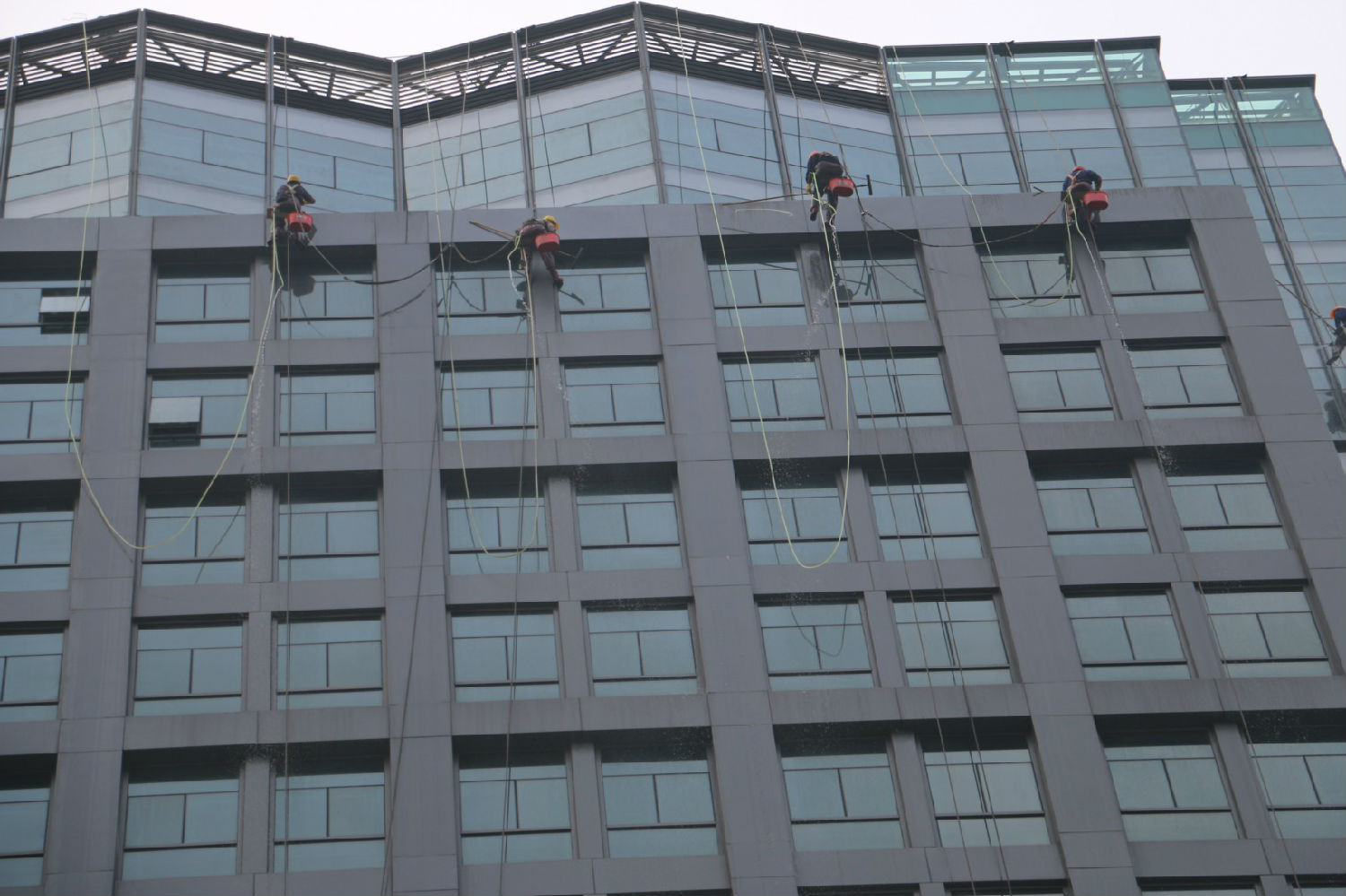 6、高空人員自行調(diào)整工作繩,使其拉緊,確認自己座穩(wěn)后,開始清潔工作。注意事項:應注意將繩子避開棱角處,或銳利處,防止損傷繩子,有高壓線的地方不可下繩。天氣狀況:在風力大于5級以上,雷雨天氣不能下繩。
